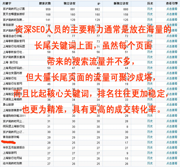 什么是核心关键词?是通常放在首页标题里的关键词。一般具有如下特征: (1)描述网站展示的主要产品或服务、基本特色等 (2)具有行业共同性,即同行网站也会设置,常常具有较大竞争性 (3)一般网站的核心关键词不超过3个 (4)每个核心关键词的百度日搜索总量通常不低于100人次 什么是长尾关键词?是通常放在网站不同内容页标题里的关键词。一般具有如下特征: (1)描述所在的内容页的产品或服务信息,个性化突出 (2)每个页面可以设置1-2个长尾关键词,一个网站往往可以有几百几千甚至海量的长尾关键词 (3)单个长尾关键词搜索流量可能只有几十甚至几个IP,但大量长尾关键词可以聚沙成塔,其带来的总搜索流量往往可以超过核心关键词 (4)长尾关键词由于比较精准,带来的客户成交转化率往往比较高 大部分人都了解如何利用首页做核心关键词排名,但往往忽视了长尾关键词。其实,网站SEO做得非常成功的,大部分受益于对长尾关键词的操作。以下是上海某著名旅游网站客户的流量截图: