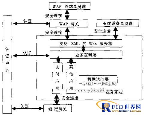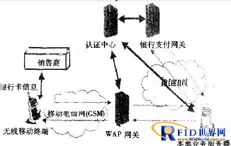 以WAP协议应用模型为基础,将现有的POS机升级为支持WAP协议的无线移动终端。利用现用的无线通信网络。通过WAP协议应用网关,实现与连在Internet上业务服务器进行交互。为了完成支付功能,作为可信任的第三方的安全认证中心由中国金融认证中心CA来承担。原有的业务系统将通过虚拟专有网VPN来与本地银行支付网关建立连接。系统业务流程如图1。
